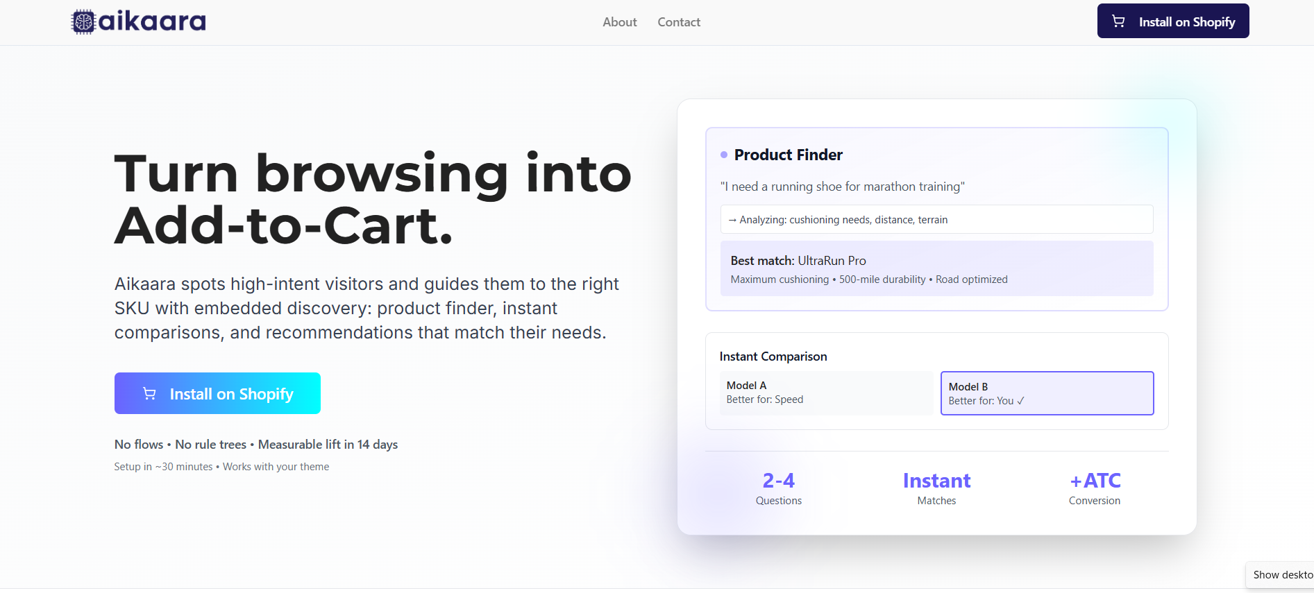 Aikaara embeds lightweight discovery modules—such as product finders, instant comparisons, and intent‑matched recommendations—directly into Shopify storefronts to help visitors choose the right SKU faster and with more confidence. It uses behavior signals and product attributes to guide decisions, reducing analysis paralysis and increasing add‑to‑cart rates. Aikaara includes analytics to measure conversion impact and tracks sessions influenced by its interactions. It’s built for merchants with sizable catalogs looking to improve discovery without complex setup.