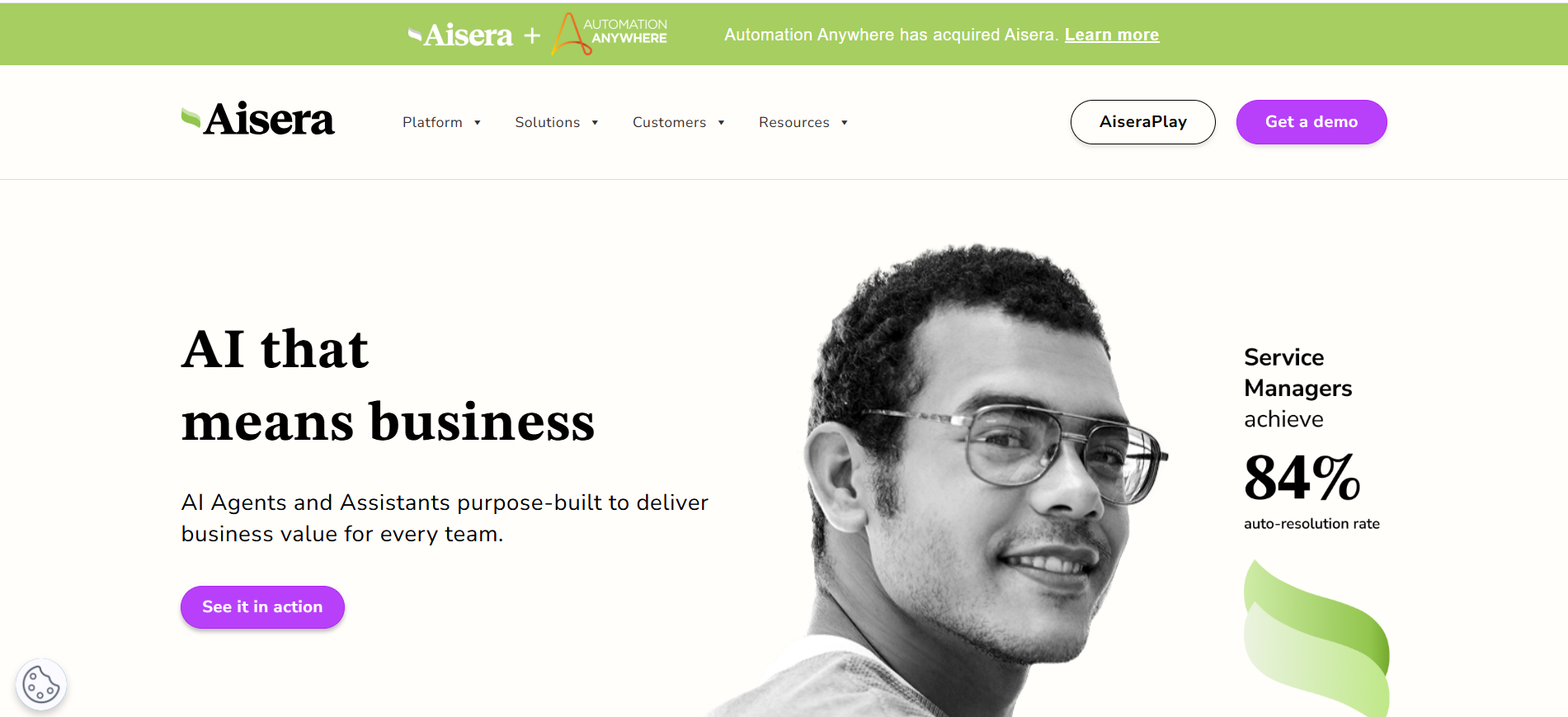 Aisera delivers a unified AI agent platform that goes beyond traditional chatbots to autonomously understand intent, execute multi-step workflows, and orchestrate actions across enterprise systems. It helps organizations reduce costs, improve employee productivity, and boost self-service resolution rates. With domain-specific agents, integrations with major systems (e.g., ServiceNow, Salesforce), and continuous learning capabilities, Aisera supports complex enterprise use cases. The platform is recognized by industry analysts for innovation in AI service management.