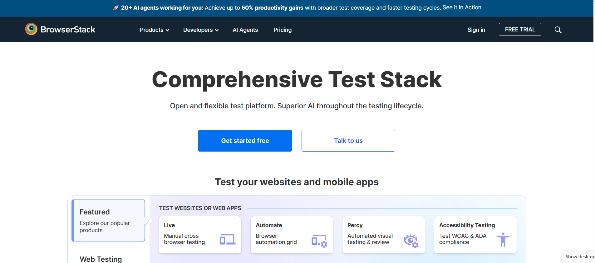 BrowserStack provides instant access to thousands of browsers and real mobile devices to execute cross-browser and app tests at scale. It integrates AI agents throughout the testing lifecycle to help teams accelerate test creation, debugging, and reporting. The platform supports a broad set of testing tools including manual live testing, automated Selenium testing, low-code automation, test management, and accessibility compliance tools. Trusted by over 50,000 teams globally, it streamlines quality assurance in DevOps workflows.