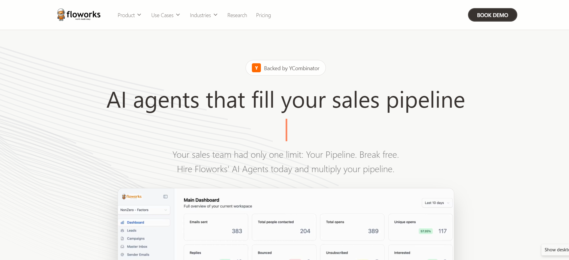 Floworks is a generative AI SaaS platform designed to automate sales development and outbound workflows using AI “employees.” Its flagship AI SDR, Alisha, performs end-to-end sales tasks including ideal customer profile research, lead generation, personalized outreach, follow-ups, and meeting scheduling. The platform leverages a proprietary AI model called ThorV2 to analyze prospect data across hundreds of web sources and generate highly personalized communications. Floworks integrates with tools like CRM systems, email platforms, and LinkedIn to run omnichannel outbound campaigns from a single interface. By automating repetitive sales tasks and providing intelligent insights, Floworks enables sales teams to scale pipeline generation while focusing on closing deals.