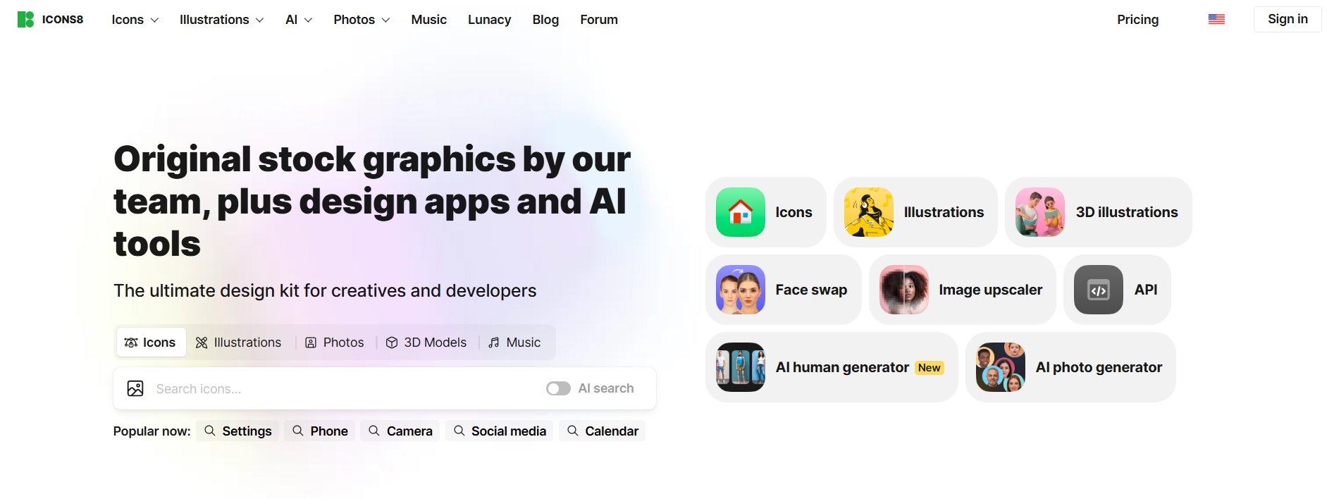 Icons8 is a comprehensive creative platform that provides high-quality design assets including icons, illustrations, stock photos, 3D models, and music. It also offers a suite of AI-powered tools such as background removal, image upscaling, face swapping, and AI-generated images to streamline design workflows. Unlike many marketplaces, Icons8 creates its assets in-house using teams of designers, ensuring consistency across its library. The platform includes design apps like Lunacy and plugins for tools such as Figma and Photoshop, making it easy to integrate assets directly into workflows.