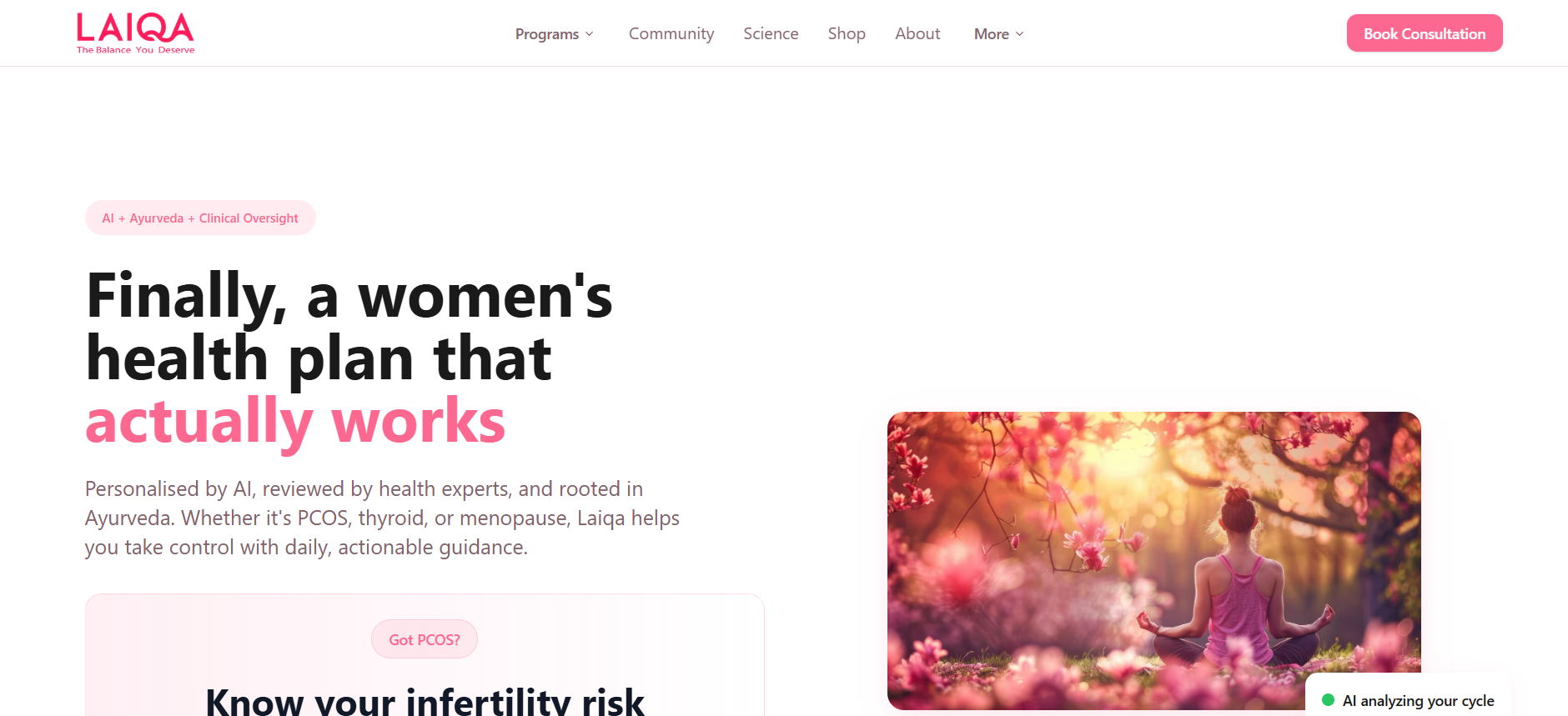 LAIQA is a femtech platform designed to address hormonal health challenges such as PCOS, menstrual irregularities, stress, and fertility. It uses AI-driven analysis to track hormonal patterns and provide personalized recommendations across diet, lifestyle, and wellness. The platform integrates Ayurvedic principles with modern medical insights to create a holistic approach to women’s health. Users benefit from features like cycle-synced wellness plans, mood and energy tracking, and access to experts including doctors and nutritionists. Positioned as a lifelong companion, LAIQA supports women across different life stages—from menstruation to menopause—with continuous, adaptive guidance.