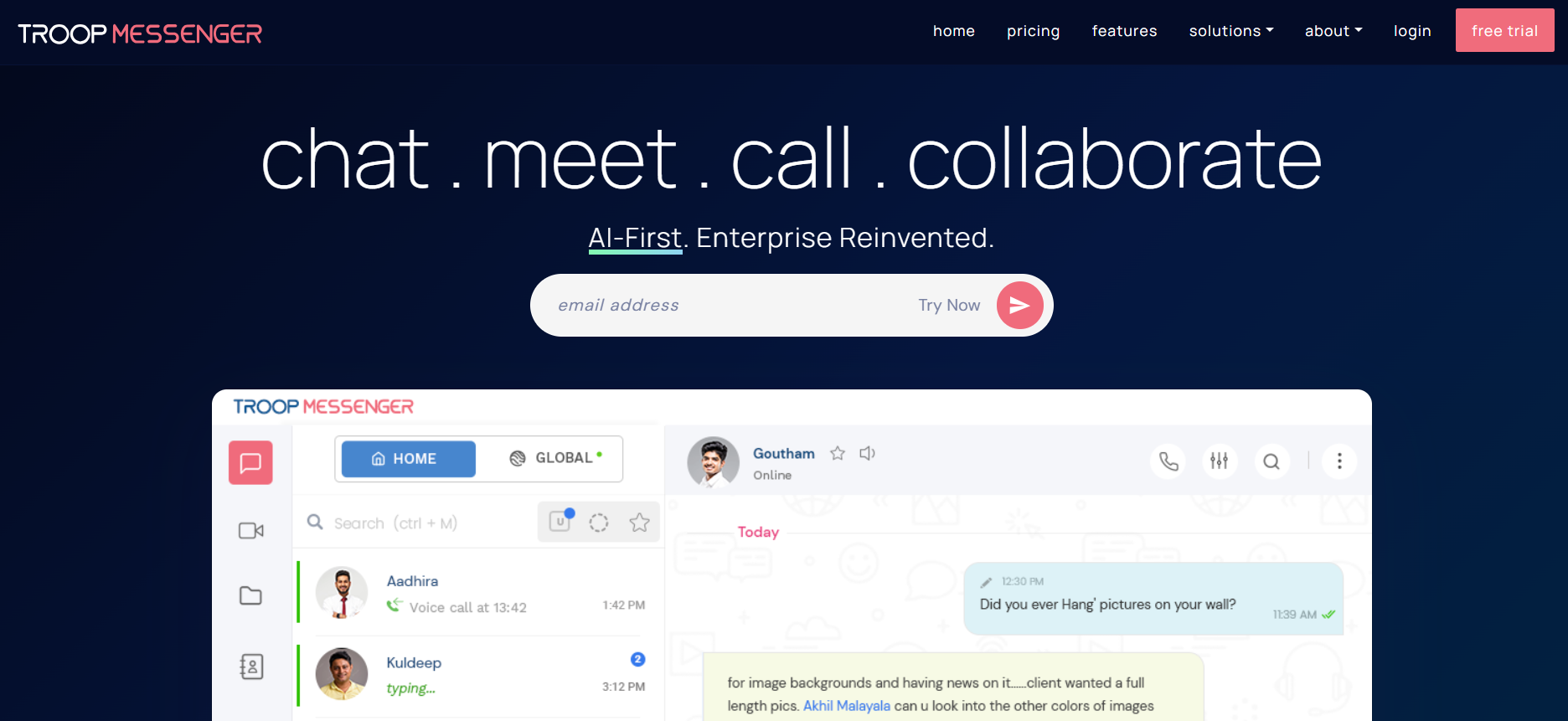 Troop Messenger is a business communication platform built to streamline internal collaboration and replace fragmented workplace messaging tools. It offers instant messaging, group chats, audio and video calls, file sharing, and advanced search features to help teams communicate efficiently. The platform includes enterprise-grade capabilities such as screen sharing, admin controls, role-based access management, and integrations with tools like Google Drive and Dropbox. Troop Messenger also supports secure deployments including SaaS, on-premise hosting, and custom deployments for regulated industries. By combining secure messaging with collaboration and productivity tools, it provides organizations with a centralized communication platform for modern workplaces.