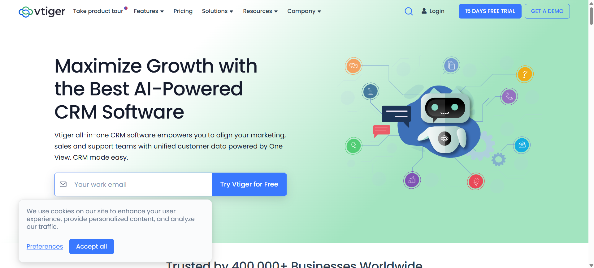 Vtiger CRM provides an all-in-one solution for managing customer interactions across marketing, sales, and customer support. Its intelligent One View consolidates customer data into a central dashboard, enabling teams to streamline communication and workflows. The platform supports automation, AI-driven insights, and integrations with 500+ apps for extended functionality. Flexible pricing and customization options adapt to the needs of startups through enterprises.