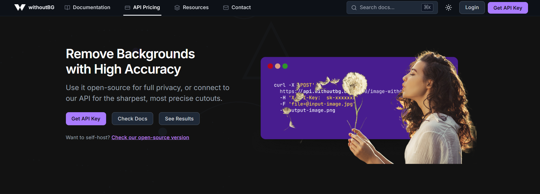 withoutBG is a flexible AI background removal platform designed for developers, businesses, and privacy-conscious users. It provides multiple deployment options, including a hosted API for high-performance processing and an open-source model that can run locally or be self-hosted. The platform uses advanced deep learning techniques such as depth estimation, saliency detection, and refinement models to produce accurate cutouts with strong edge detection. Users can integrate it via API, Python SDK, or Docker-based web apps, making it highly adaptable for automation and large-scale workflows.